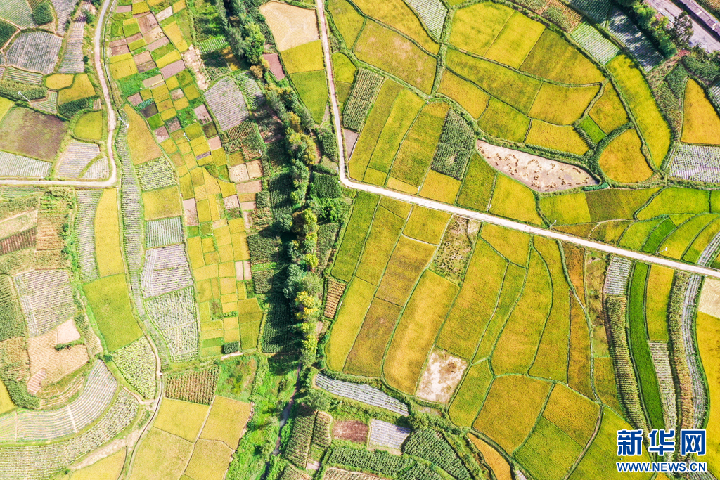 俯瞰稻黄乡村美(9月25日摄)。新华网发(孙文来 摄)