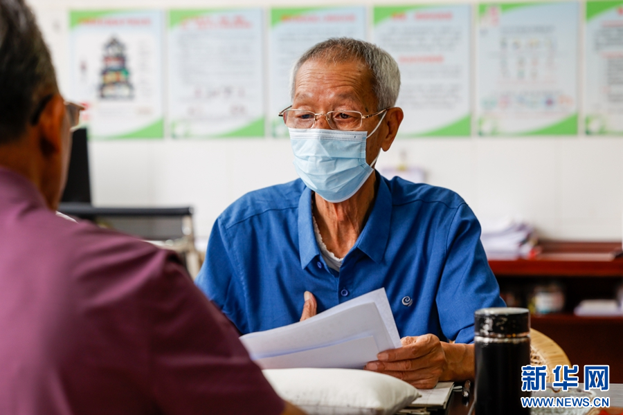 义诊工作室里,李伯藩带着两名年轻人,一起为患者诊断病情(摄于7月12日)。新华网 赵普凡 摄