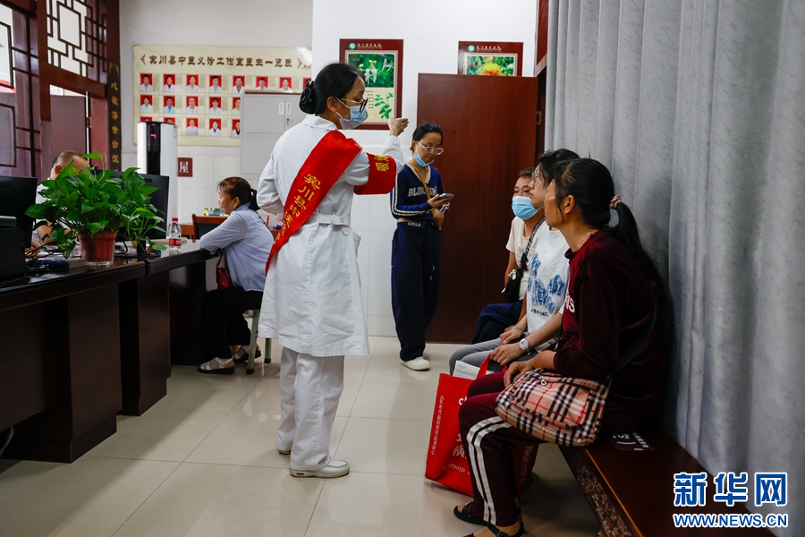 义诊工作室外,医务人员引导患者就诊。(摄于7月12日)。新华网 赵普凡 摄