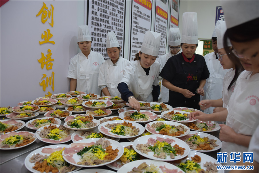 在厨艺实训室,老师指导学员学习过桥米线的摆盘(10月22日摄)。新华网发(薛莹莹 摄)