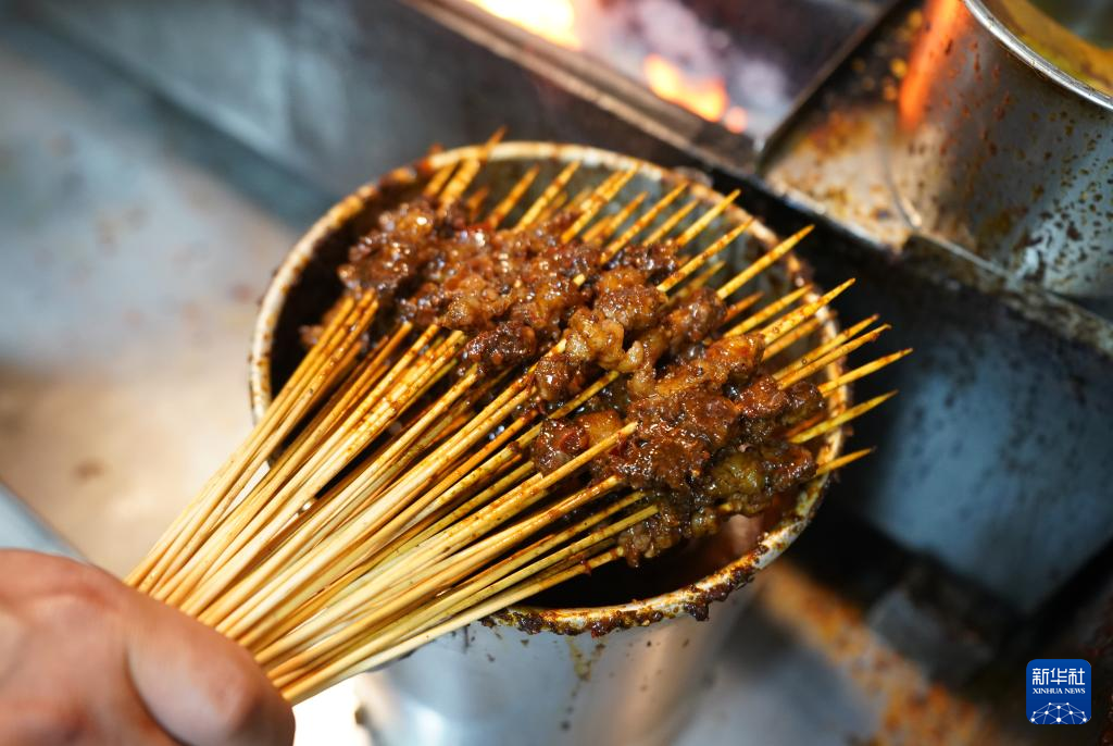 11月2日在昭通市昭阳区一家烧烤店内拍摄的正在烤制的小肉串。新华社记者 陈欣波 摄