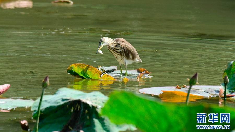 云南省弥勒市湖泉柳园内,夜鹭在荷塘间觅食(10月27日摄)。