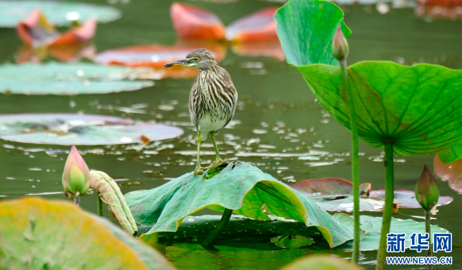 云南省弥勒市湖泉柳园内,夜鹭立于荷叶之上(10月27日摄)。