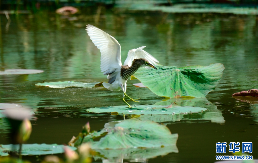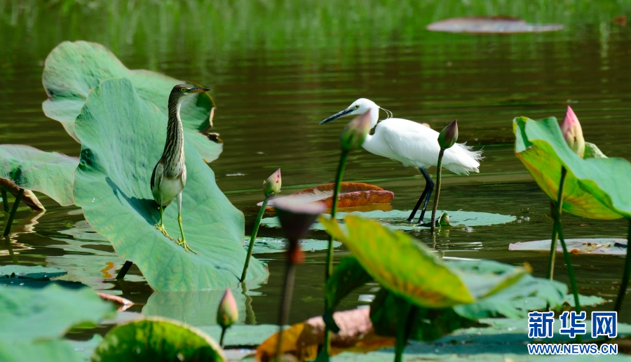 秋日里,云南省弥勒市湖泉柳园内,白鹭、夜鹭在荷塘间觅食、嬉戏。翩翩起舞的白鹭、夜鹭与荷塘构成一幅秋日里的美丽图画。近年来,弥勒市常态化保护碧水蓝天,生态环境持续向好。新华网发(普佳勇摄影报道)