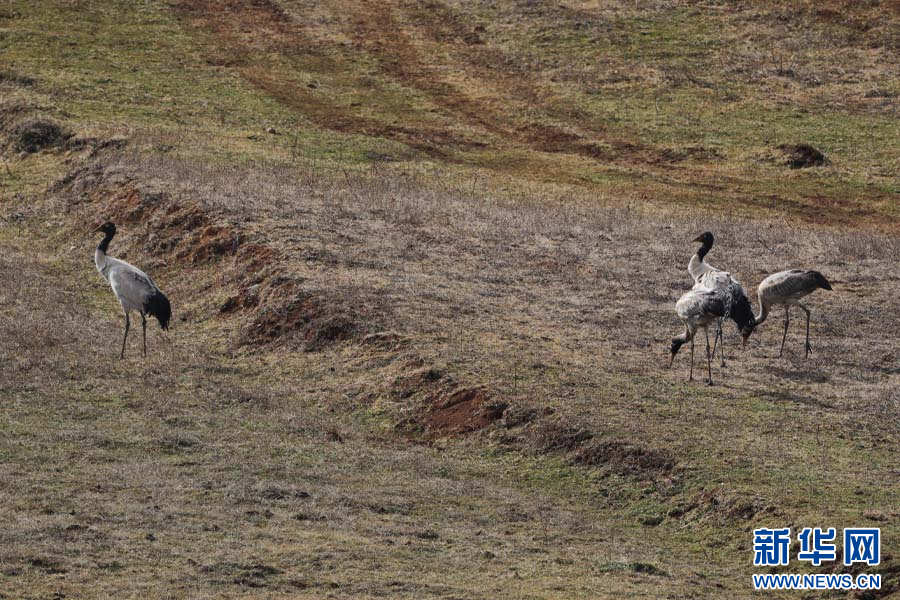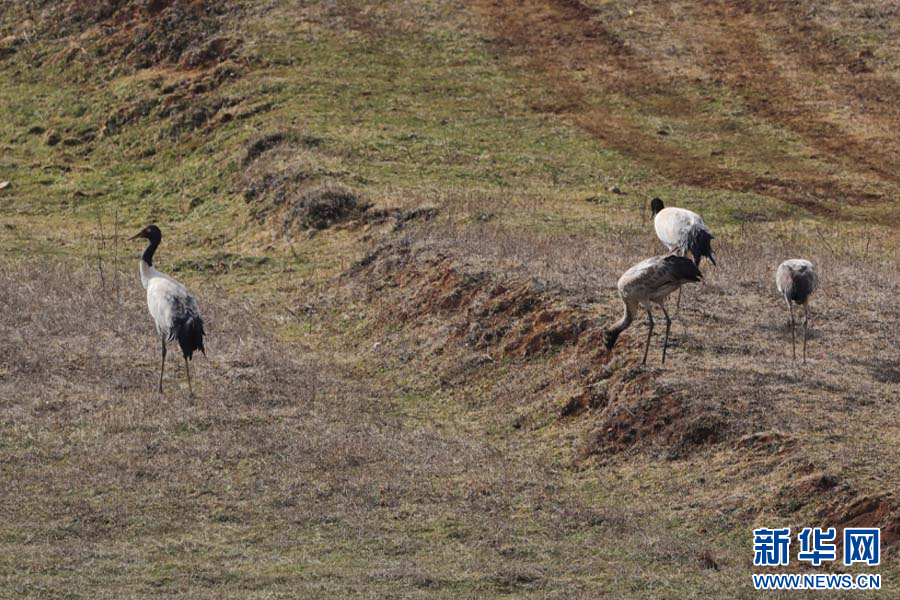 首批飞抵自然保护区的四只黑颈鹤(11月7日摄)。新华网发(云南寻甸黑颈鹤省级自然保护区管护局 供图)