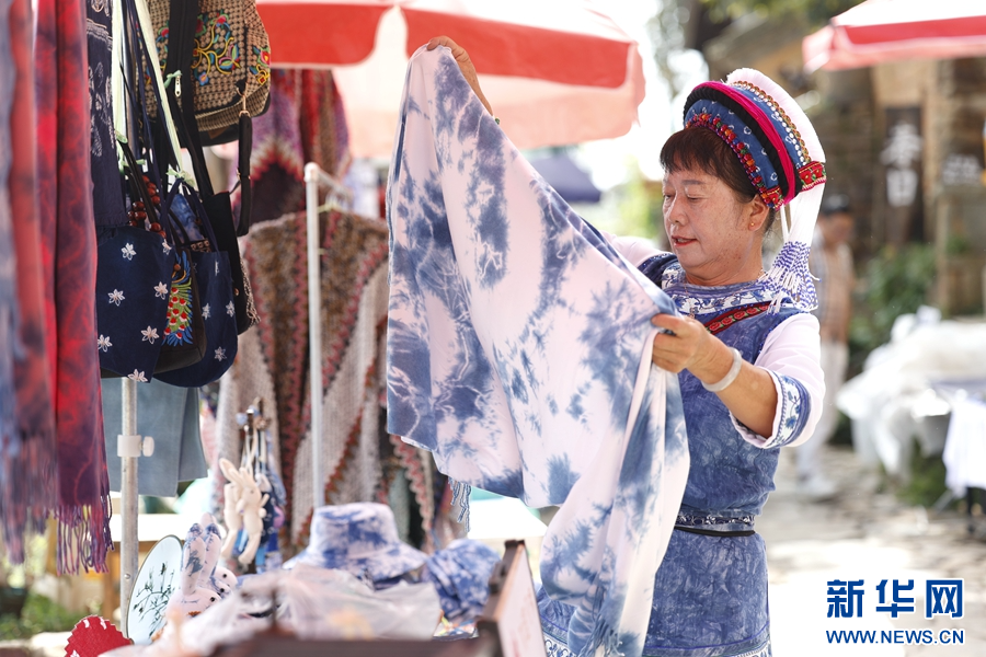 龙素云正在整理摊位上的扎染(摄于9月19日)。新华网 赵普凡 摄