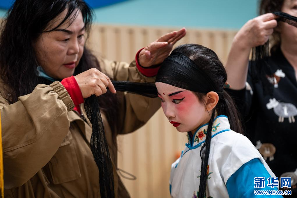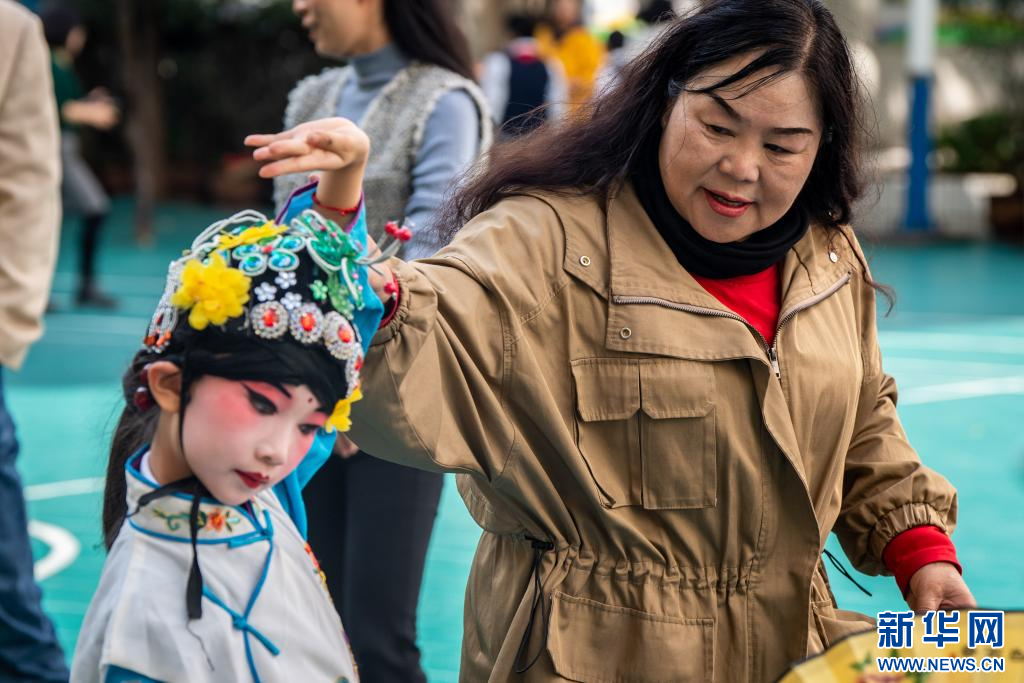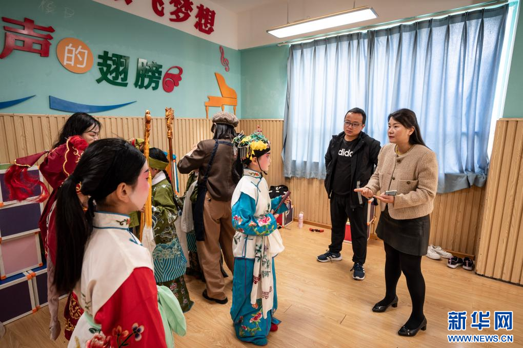 在云南省昆明市五华区文林小学,罗秀华老师在对少儿滇剧传习班的小演员进行指导。