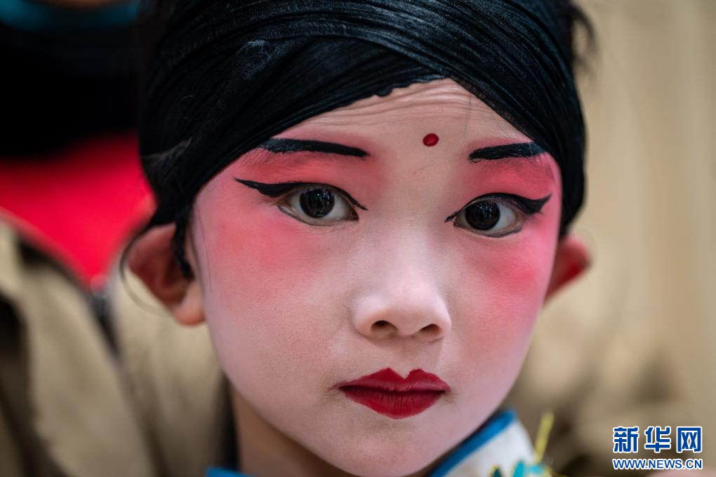 文林小学少儿滇剧传习班的小演员任亭羽化妆完成后准备表演滇剧节目。