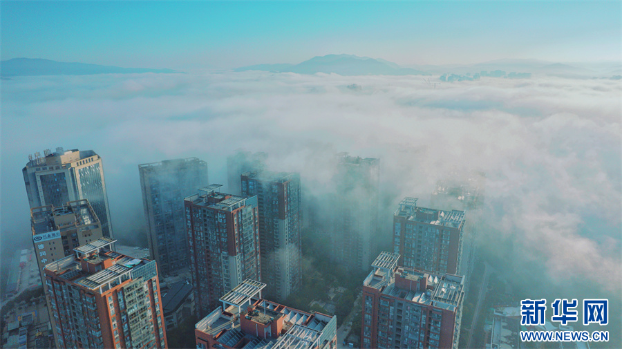 20日,云南昆明北市区上空出现平流雾景观,雾气环绕在高楼之间,仿若为楼宇披上一层薄纱,如梦如幻,宛如仙境。(完)(康静 杨景浩)