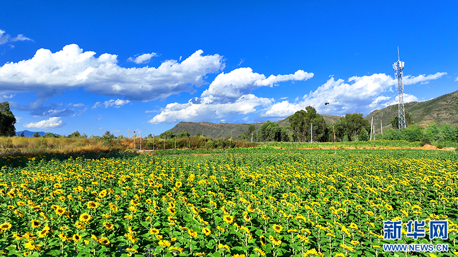 冬日里,在云南省楚雄彝族自治州永仁县猛虎乡格租村,盛开的向日葵与蓝天白云交相辉映,宛如一幅诗意的油画。(王成彪 张桂伟 李国书 杨艳丽)