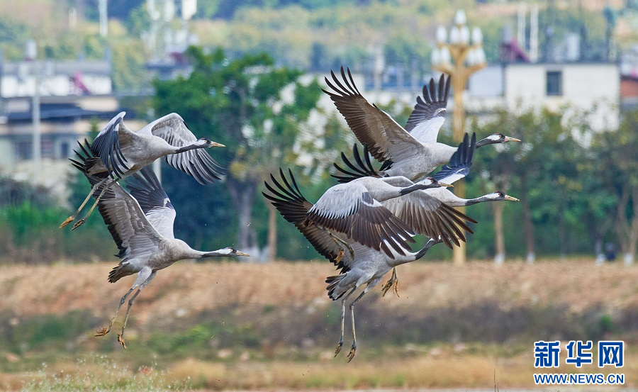 近日,云南省保山市青华海国家湿地公园附近又见成群的灰鹤,它们时而在田野上空展翅翱翔,时而在农田嬉戏觅食,成为冬日里一道美丽的风景。
