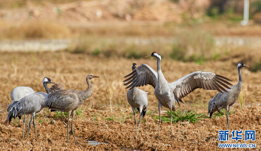在田野中嬉戏的灰鹤(11月15日摄)。新华网发(郭康 摄)