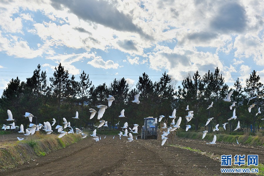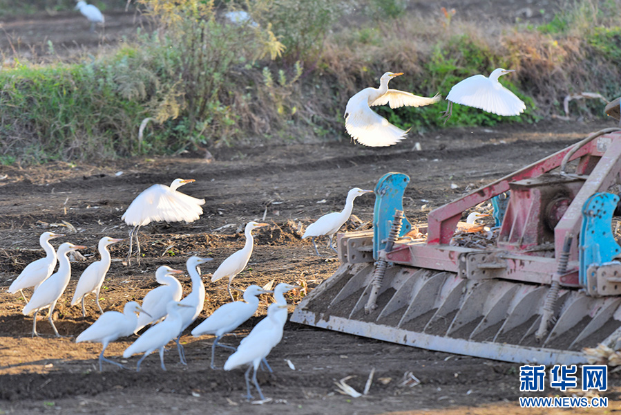 白鹭在拖拉机犁过的田里觅食(11月15日摄)。新华网发(吴再忠 摄)