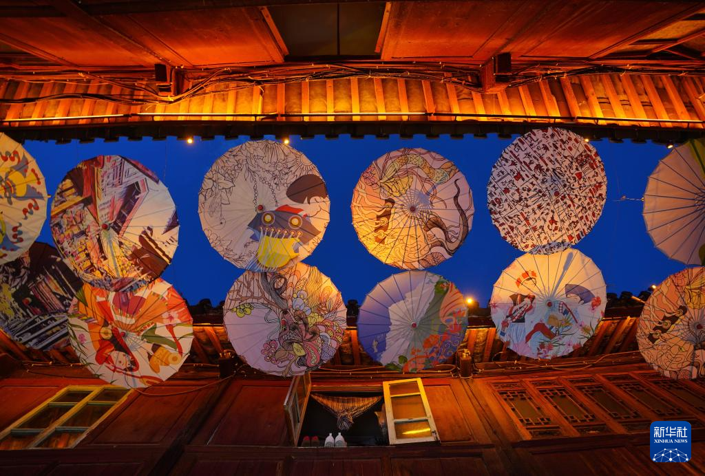 夜色中的丽江古城,灯光璀璨,油纸伞古街散发迷人魅力。