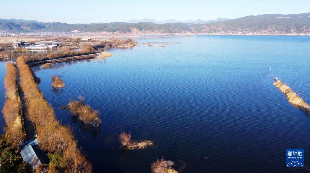 黑颈鹤和水鸟在纳帕海自然保护区栖息。
