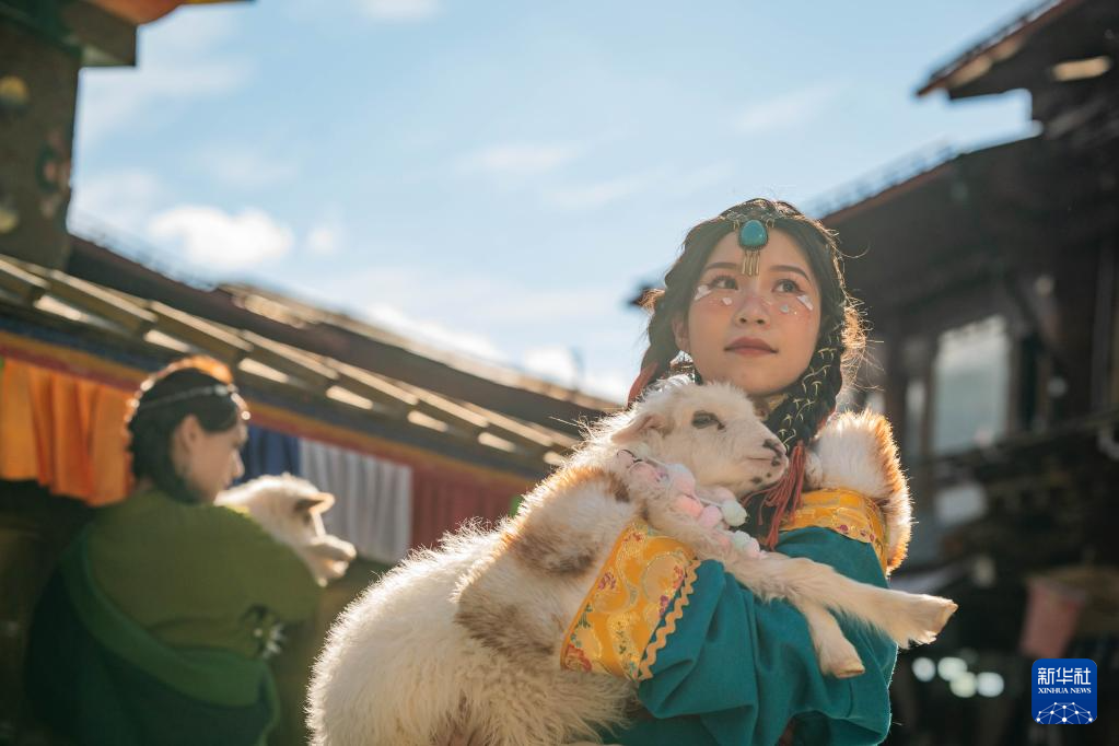 香格里拉哈巴雪山下,游人和牦牛合影。