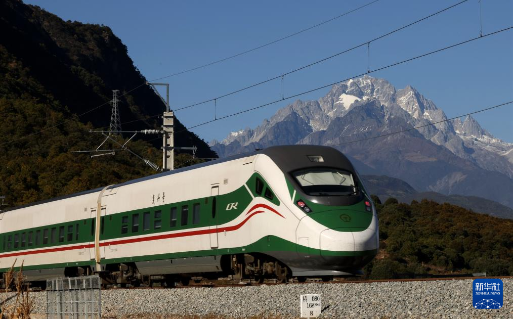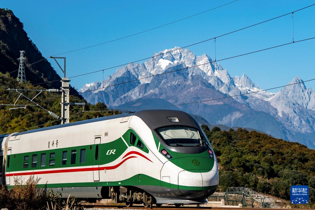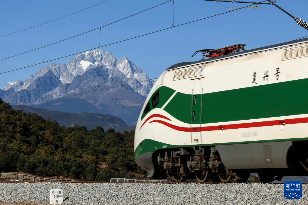 11月26日,列车从玉龙雪山脚下驶过。新华社记者 胡超 摄