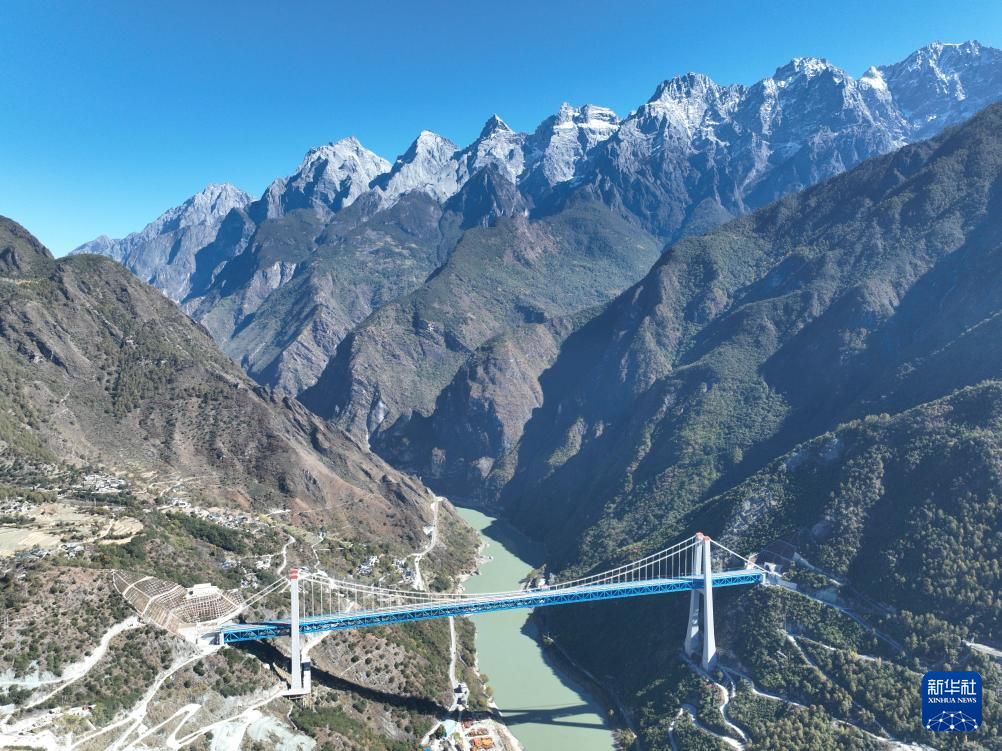 11月26日,列车驶过虎跳峡金沙江铁路大桥(无人机照片)。新华社记者 胡超 摄
