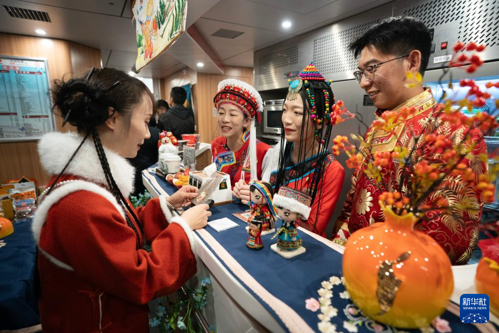 11月26日,乘坐丽香铁路首发列车的乘客(左)向列车乘务员咨询纪念品。新华社记者 陈欣波 摄
