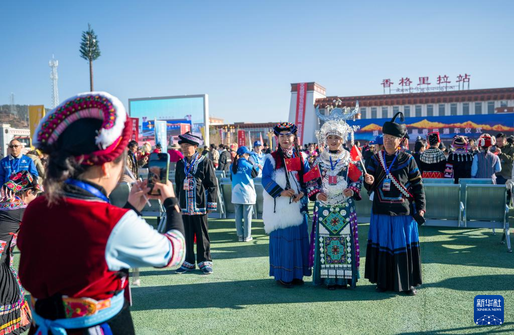 11月26日,参加丽香铁路开通仪式的少数民族代表用手机拍照留念。目前,中国移动已实现丽香铁路及沿线周边区域4/5G信号100%覆盖。新华社记者 陈欣波 摄
