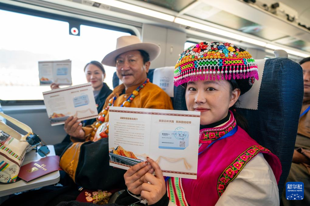 11月26日,乘坐丽香铁路开通首发列车的嘉宾在车厢内展示纪念车票。新华社记者 陈欣波 摄