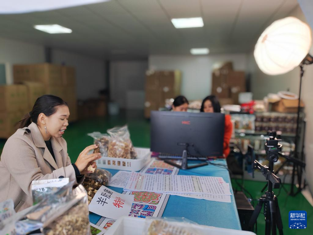 人工菌种植加工企业工作人员正在直播卖货。新华社记者 浦超 摄