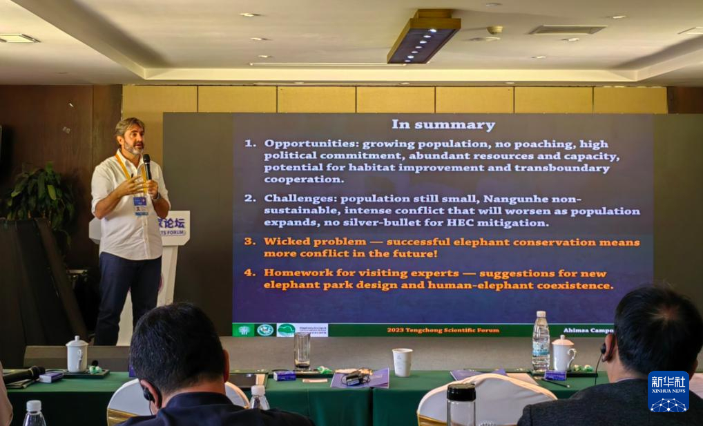 西班牙大象专家Ahimsa Campos Arceiz在做主旨报告。新华社记者 岳冉冉 摄