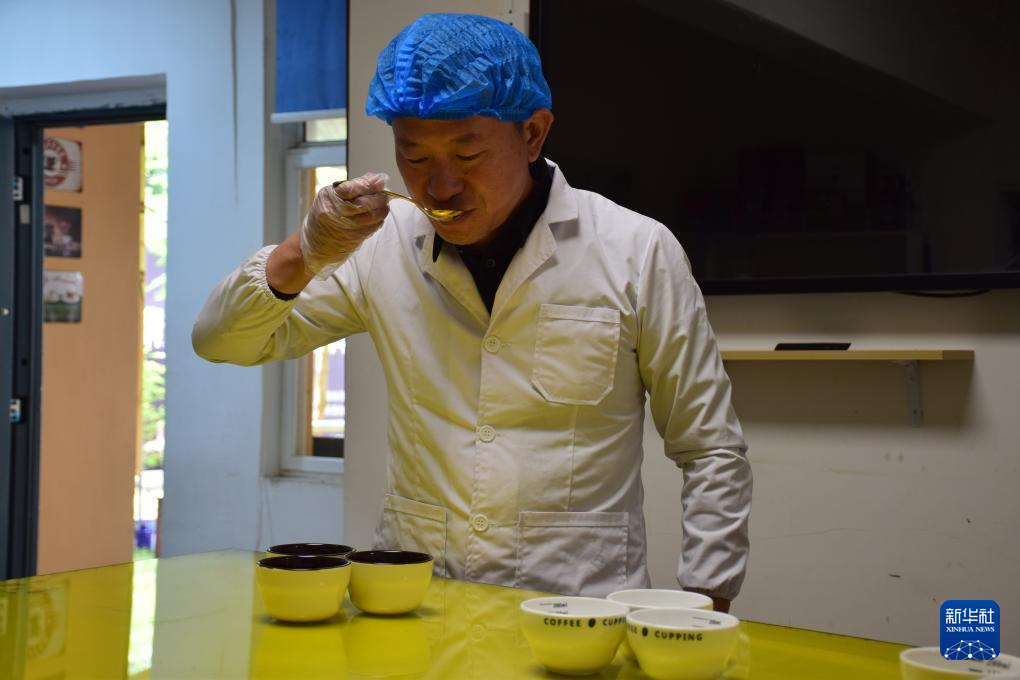 山云辉正在进行咖啡杯测。新华社记者黄韬铭 摄