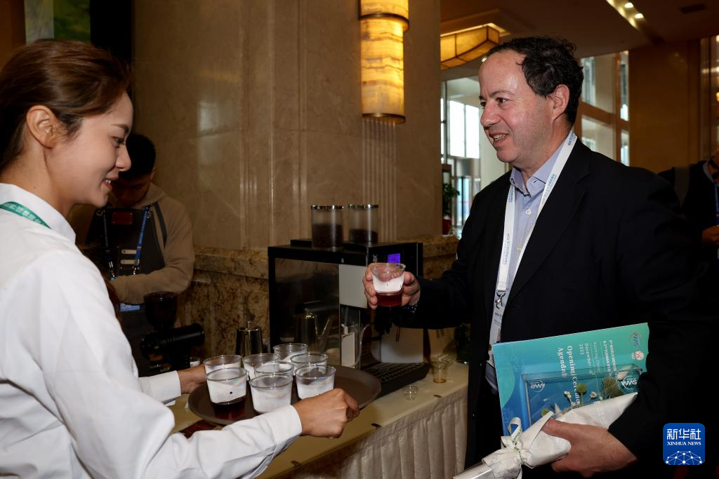 12月5日,在云南昆明参加第五届世界媒体峰会(云南分会场)暨第二届大象国际传播论坛的参会代表体验云南保山小粒咖啡。新华社记者李明摄