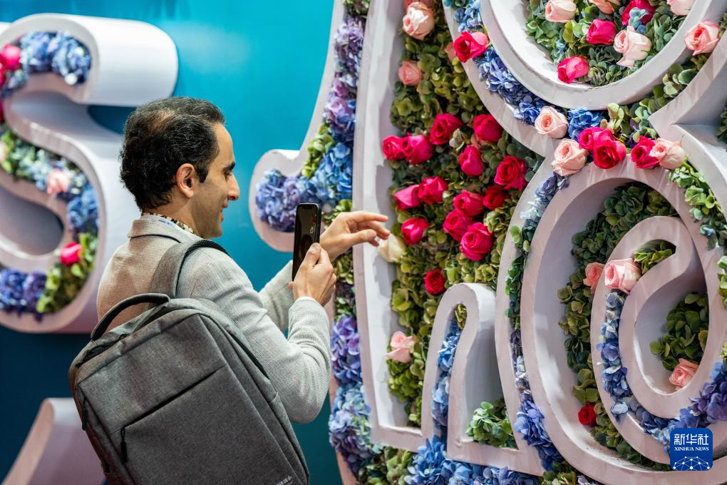 12月5日,在云南昆明参加第五届世界媒体峰会(云南分会场)暨第二届大象国际传播论坛的参会代表拍摄展出的鲜花墙。新华社记者 胡超 摄