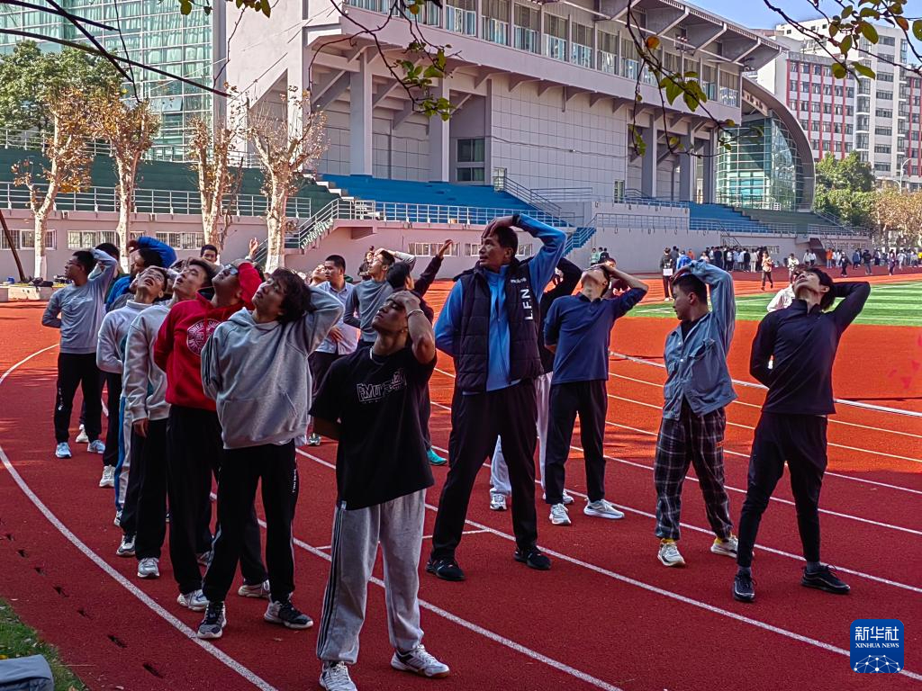 学生进行热身活动。新华社记者 岳冉冉 摄