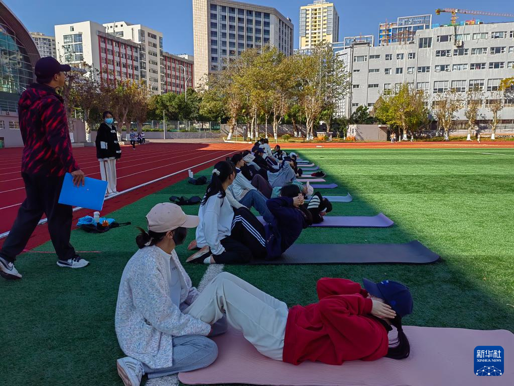 云南大学女子仰卧起坐测试。新华社记者 岳冉冉 摄