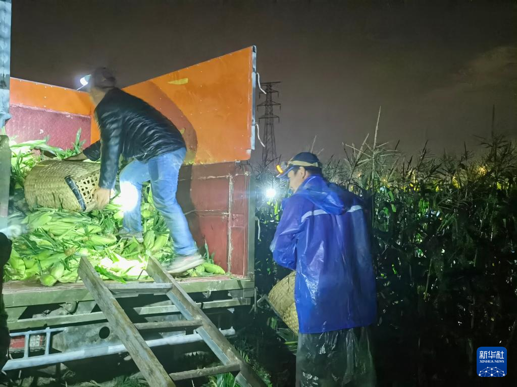 深夜,村民将刚采摘的鲜食玉米运到货车上。新华社记者 黄韬铭 摄