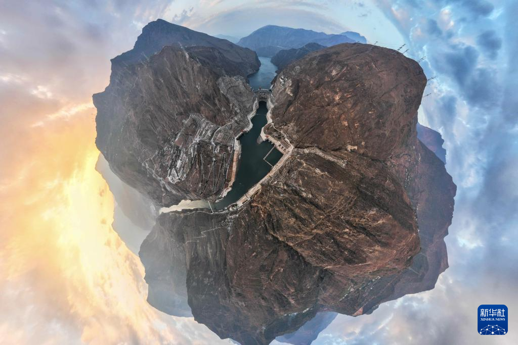 空中俯瞰乌东德水电站(无人机全景照片,12月22日摄)。新华社记者 胡超 摄