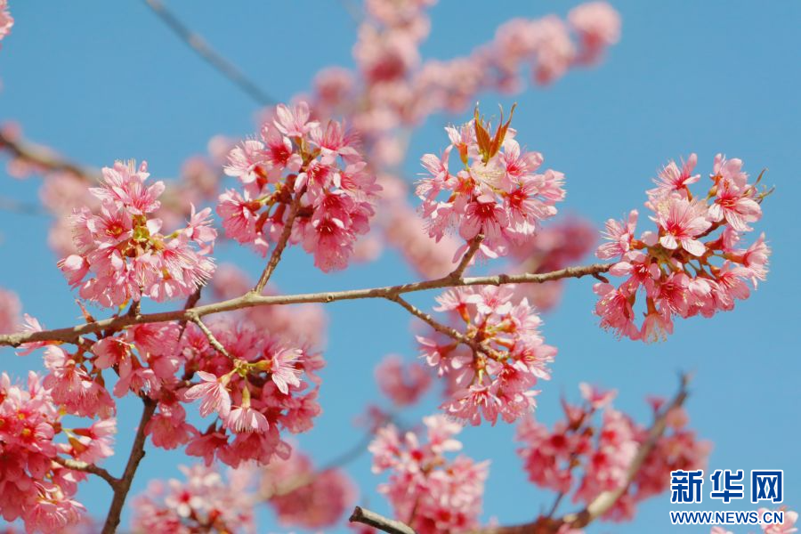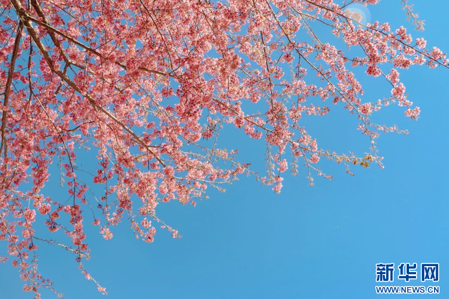 近日,云南省楚雄彝族自治州南华县龙川镇岔河村的冬樱花竞相绽放,蓝天白云下,冬樱花与天空互相映衬,形成一道靓丽的风景线。(李娅洁)