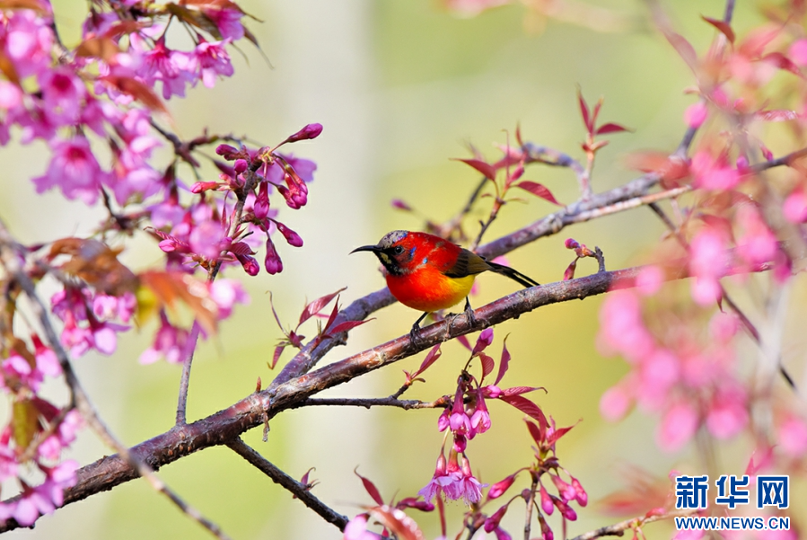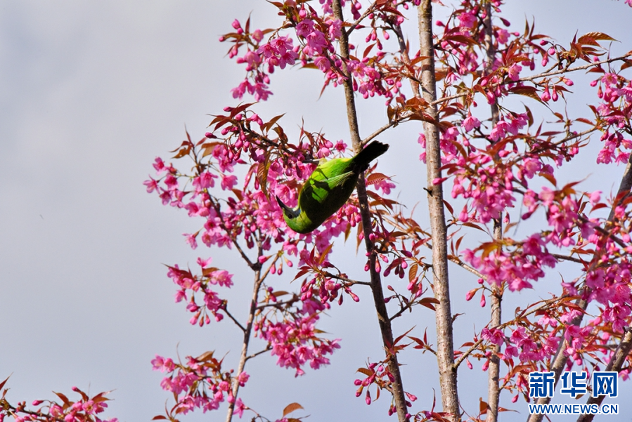 樱花开处鸟欢乐(12月16日摄)。新华网发(吴再忠 摄)