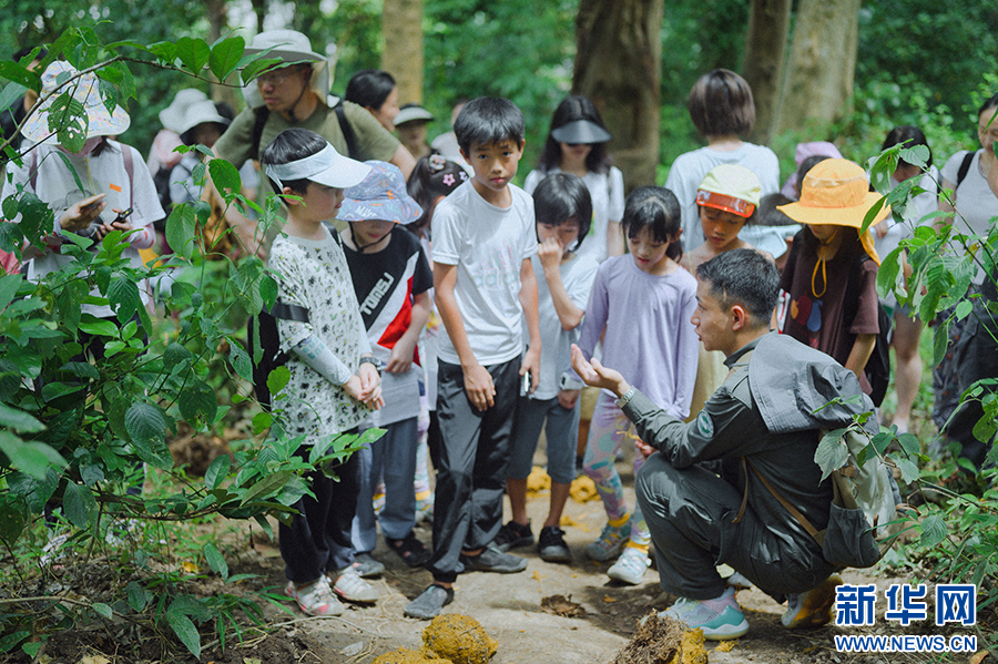 野象谷内,孩子们正在观察大象粪便(资料图)。新华网发(供图)