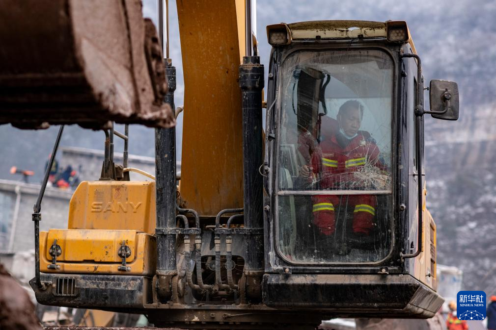 1月24日,中国安能一局唐山分公司挖掘机操作手王霄在救援现场驾驶挖掘机。