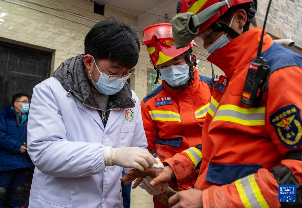 1月24日,镇雄县人民医院医生付凯(左)在现场为救援人员清理伤口。