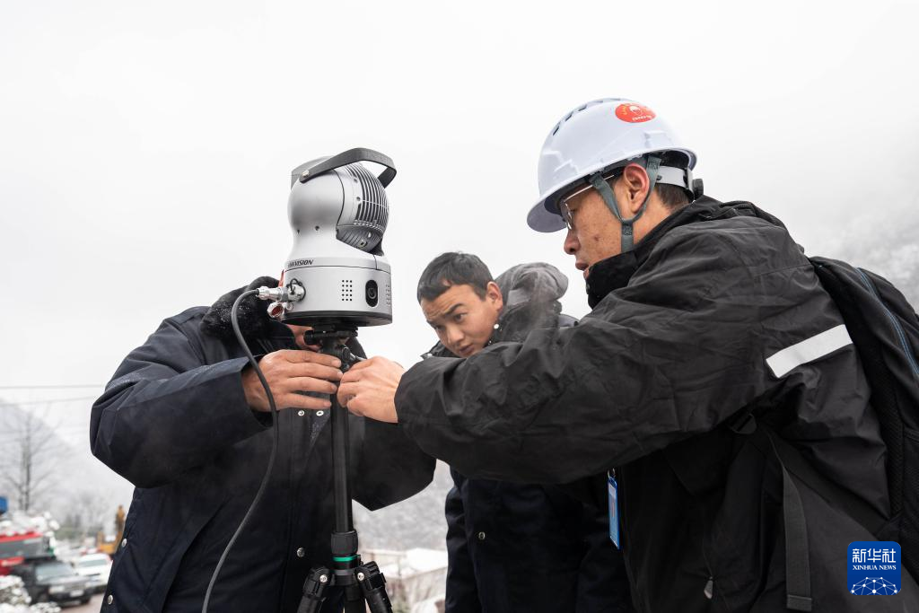 1月24日,中国移动工作人员陈晗(右)在镇雄县塘房镇凉水村安装救援设备。