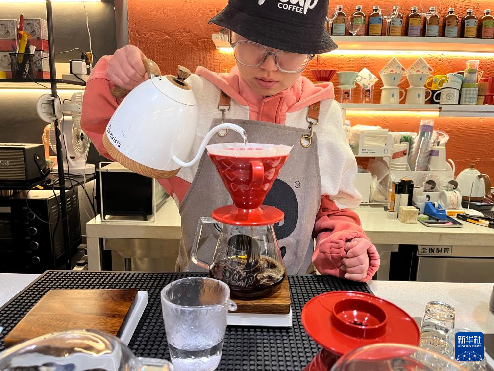 PcupCoffee咖啡馆店员正在制作手冲咖啡。新华社发(刘芷吟 摄)