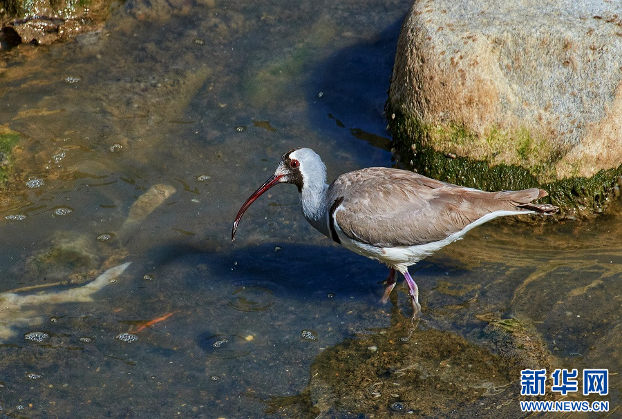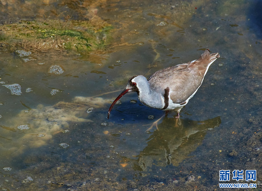 鹮嘴鹬在觅食(1月18日摄)。新华网发(郭康 摄)