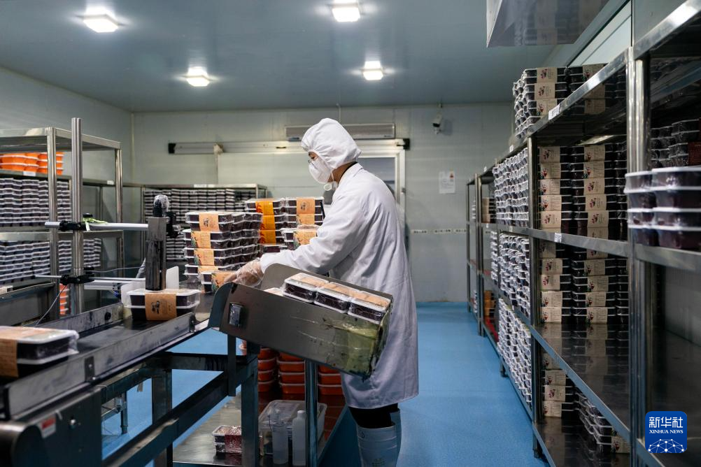 1月26日,一名工作人员在中国铁路昆明局集团有限公司冷链套餐生产基地内将流水线上的冷链套餐取下码放整齐。新华社记者 陈欣波 摄