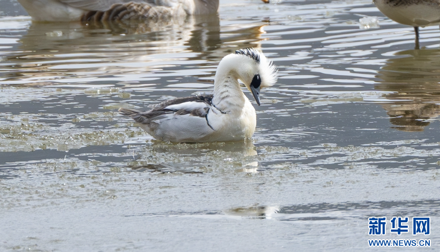 1月27日,摄影师在云南省迪庆藏族自治州纳帕海国际重要湿地,拍摄到一种头部黑白相间的野鸭,经鉴定该物种为有“熊猫鸭”之称的斑头秋沙鸭,是国家二级重点保护野生动物。