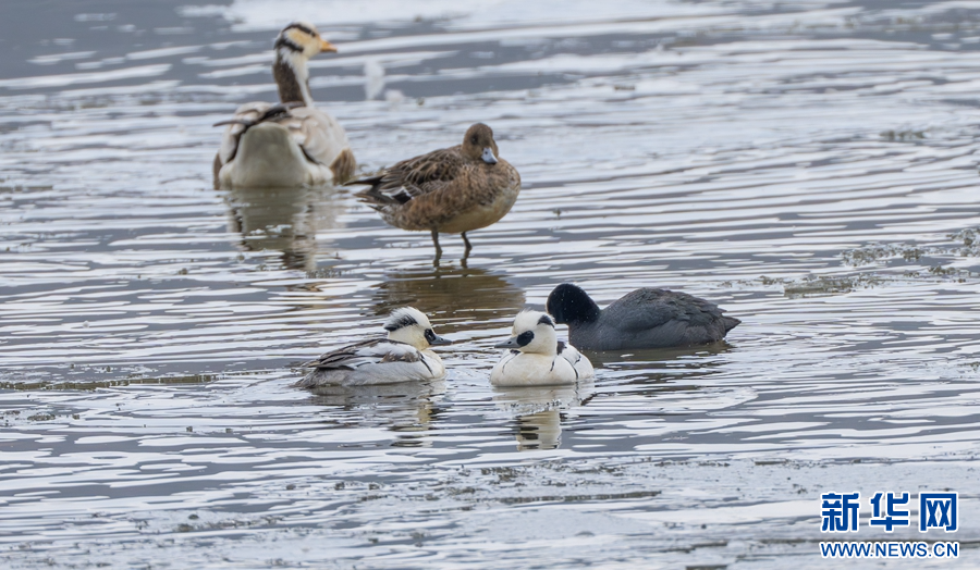 两只斑头秋沙鸭雄鸟与其他鸟类同框(1月27日摄)。新华网发(朱边勇 摄)