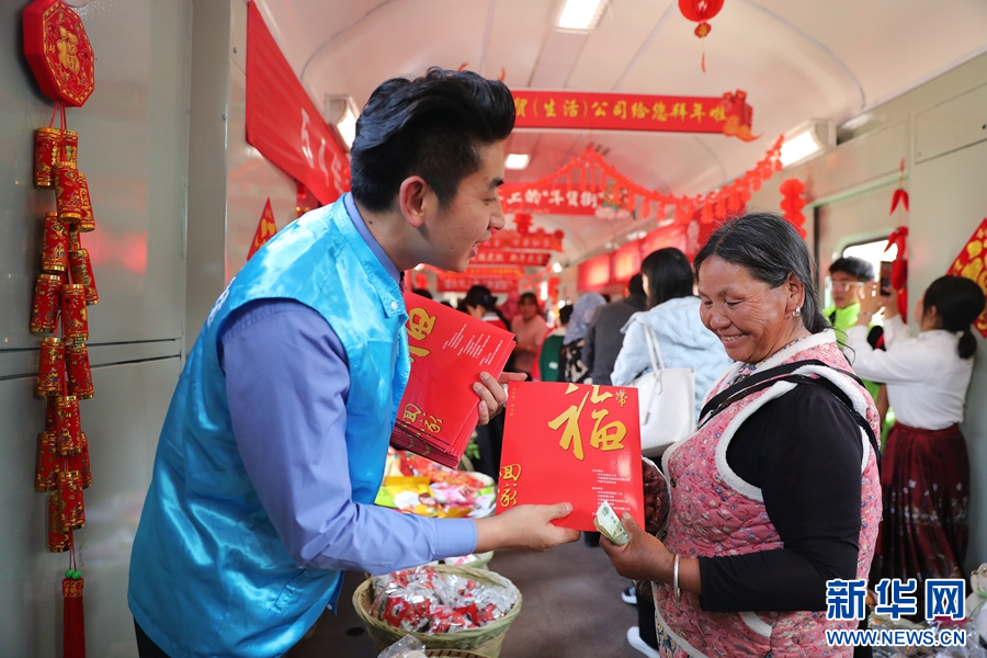 2月2日,“慢火车”年货街上,列车工作人员为乘客送福字。新华网发(杨紫轩 摄)