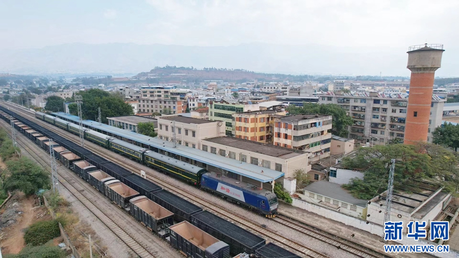 2月2日,航拍视角下的昆明至元谋西7466/5次列车。新华网发(杨紫轩 摄)