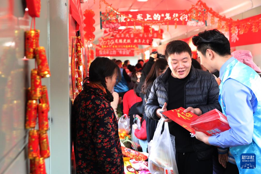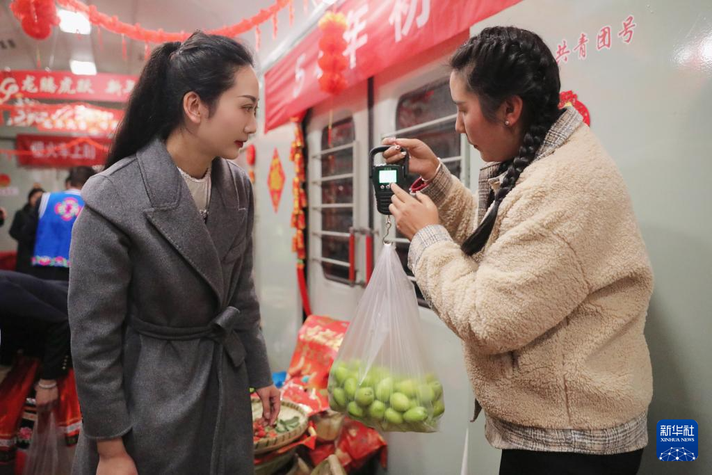 春节临近,家家户户忙着采买年货。中国铁路昆明局集团有限公司在云南昆明至元谋西的公益性“慢火车”7466/5次列车上办起了年货街。