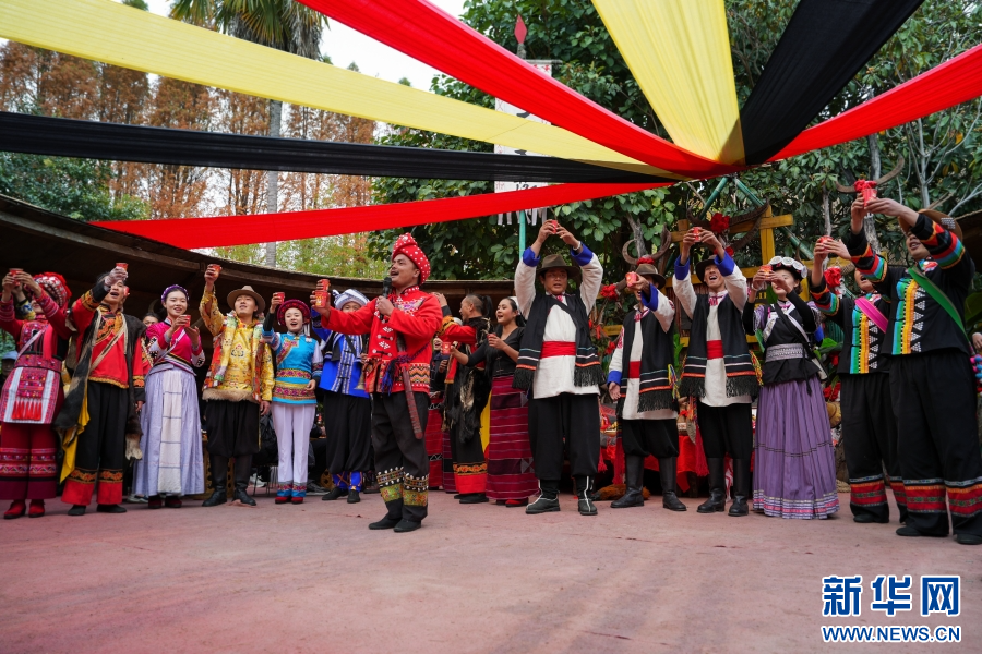 基诺族和拉祜族拜年(2月14日摄)。新华网发(云南民族村供图)