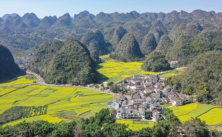 黄灿灿的油菜花点缀着山水田园(2月16日摄)。新华网发(吴再忠 摄)